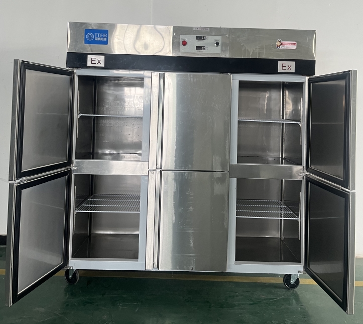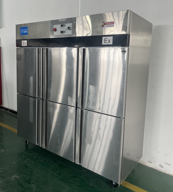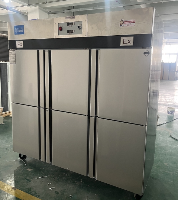 我公司生產的六門不銹鋼同騰防爆冰箱(以下簡稱防爆冰箱),產品防爆要求是根據GB3836.1-2010《爆炸性環境 第1部分:設備 通用要求》、GB3836.2-2010《爆炸性環境 第2部分:由隔爆外殼“d”保護的設備》、GB3836.4-2010《爆炸性環境 第4部分:由本質安全型“i”保護的設備》、GB3836.9-2006《爆炸性氣體環境用電氣設備 第9部分 澆封型“m”》及GB3836.15-2017《爆炸性氣體環境用電氣設備 第15部分:電氣裝置的設計、選型和安裝》的規定制成防爆結構,經國家授權的質量監督檢驗部門檢驗合格,其防爆標志為ExdbibmbⅡCT4 Gb。適用于工廠存在或可能存在ⅡA、ⅡB級、ⅡC,T1~T4組可燃性氣體、蒸氣與空氣混合形成的爆炸危險1區或2區場所。該產品經國家防爆電氣產品質量監督檢驗中心檢驗合格并取得了防爆合格證??照{機廣泛適用于石油、化工、冶金、制藥和國防工業等空氣中存在爆炸性氣體混合物的自封閉的室內之用。